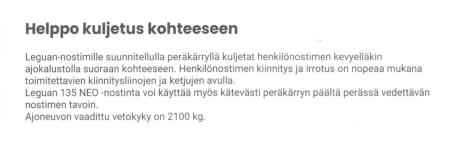 | Kuljetuskärry sisältyy nostimen hintaan, kärryn tiedot täältä | |